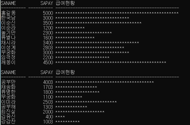 select saname, sapay, lpad('*', (sapay/100), '*') "급여현황"