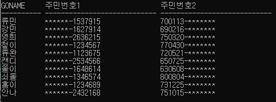 select goname, lpad(substr(gojumin, 7, 8),14, '*') "주민번호1" ,rpad(substr(gojumin, 1, 7),14, '*') "주민번호2" from gogek;