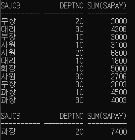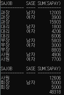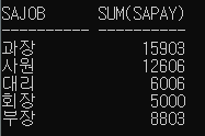 select sajob, count(*) 인원수, sum(sapay) 급여합계 from sawon