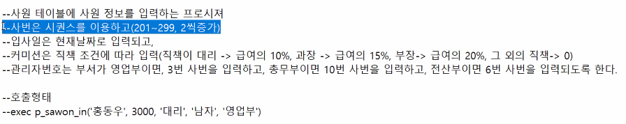 exec p_sawon_up(201, 3500, '과장', '관리부') -> 201번 사원의 정보를 지정한 값들로 변경