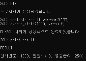 output := '입사년도 : ' || year || ', 인원수 : ' || cnt || ', 평균급여 : ' || pay_avg;