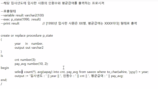 select count(*), avg(sapay) into cnt, pay_avg from sawon where to_char(sahire, 'yyyy') = year;