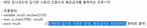 --print result // [1990년 입사한 사원은 XX명, 평균급여는 XXXX이다] 형태로 출력