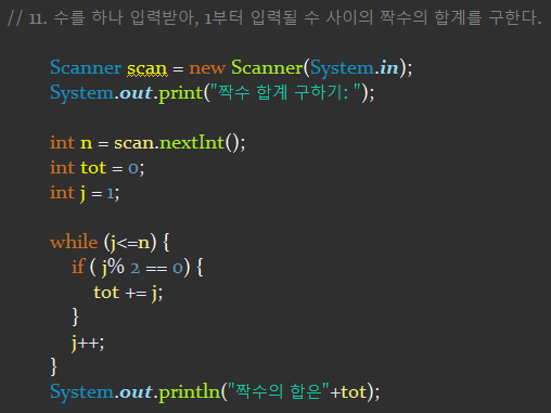 // 11. 수를 하나 입력받아, 1부터 입력될 수 사이의 짝수의 합계를 구한다.