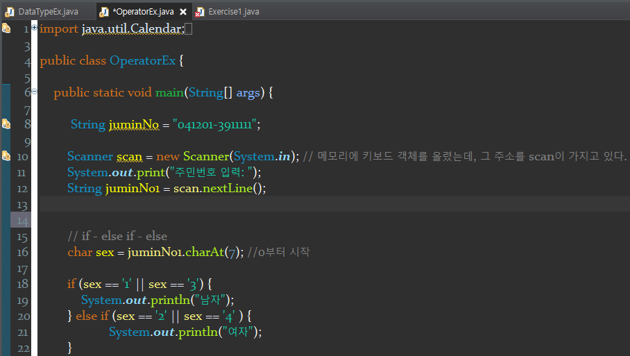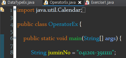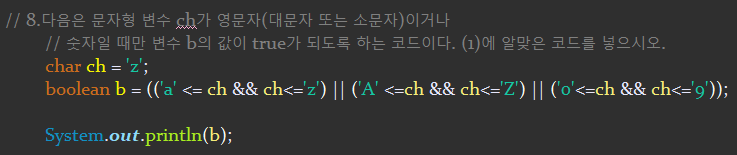 // 8.다음은 문자형 변수 ch가 영문자(대문자 또는 소문자)이거나 숫자일 때만 변수 b의 값이 true가 되도록 하는 코드이다. (1)에 알맞은 코드를 넣으시오.