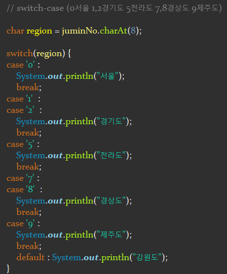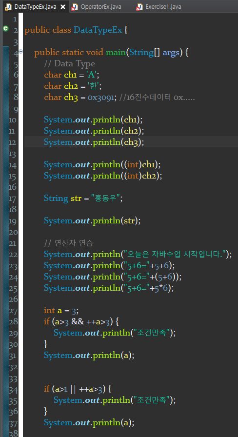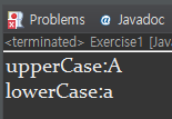 // 예를들어 'A'의 코드는 65이고 'a'의 코드는 97이다. (1)~(2)에 알맞은 코드를 넣으시오.