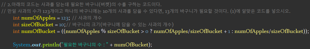 // 2.아래의 코드는 사과를 담는데 필요한 바구니(버켓)의 수를 구하는 코드이다.