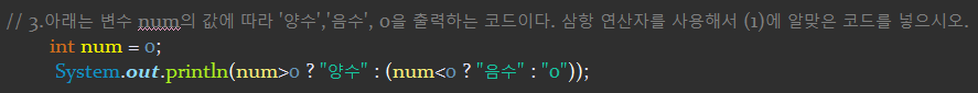 // 3.아래는 변수 num의 값에 따라 '양수','음수', 0을 출력하는 코드이다. 삼항 연산자를 사용해서 (1)에 알맞은 코드를 넣으시오.