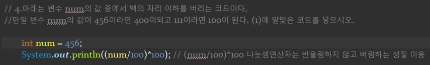 // 4.아래는 변수 num의 값 중에서 백의 자리 이하를 버리는 코드이다.