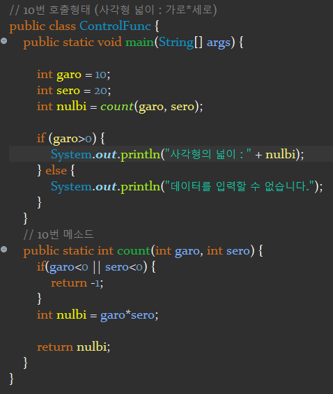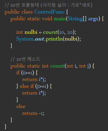 10. 정수형 데이터 2개를 매개변수로 받아서 사각형의 넓이를 계산한 결과값을 반환하는 메소드
