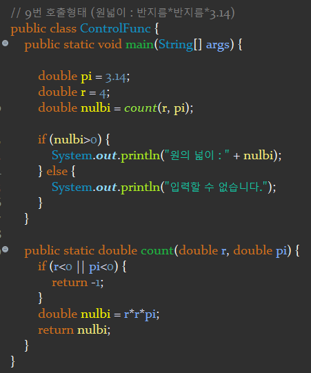 9. 실수형 데이터 2개를 매개변수로 받아서 원이 넓이를 계산한 결과값을 반환하는 메소드