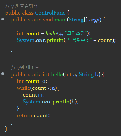 7. 반복 출력할 횟수와 문자열 내용을 매개변수로 받아서 내용을 모니터로 출력하고, 출력된 횟수를 반환하는 메소드
