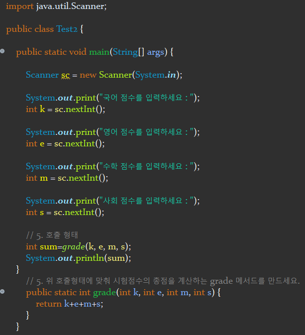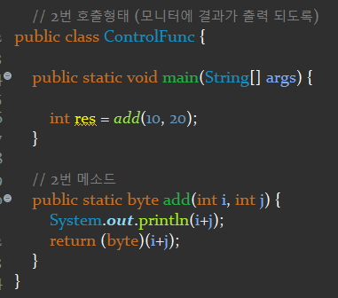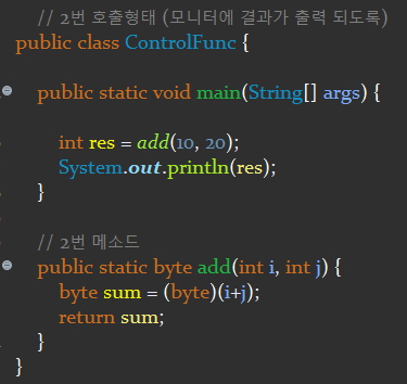 2. 정수형 데이터(byte) 2개를 매개변수로 받아서 덧셈 연산을 수행하여 결과값을 반환하는 메소드