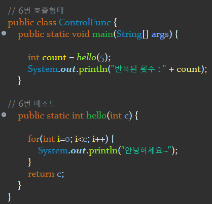 2. 메소드 바디 : 반복 횟수만큼 “안녕하세요~”라는 문장을 표준 출력한다.(단, for문 사용)