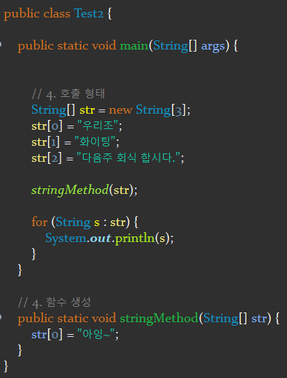 2. 메소드 바디 : 입력받은 문자열의 내용을 표준 출력한다.(단, 향상된 for문 사용)