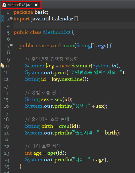 main : 식별자 = 메소드명 = identifier = 사용자 정의 = 소문자로 시작
