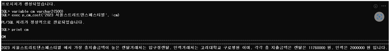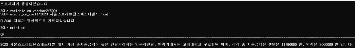 v_cm:=v_e_name||' 에서 가장 총지출금액이 높은 렌탈거래처는 '||v_max_rcm ||', 인력거래처는 '||v_max_lcm||' 이며, 각각 총 지출금액은 렌탈은 '||v_max_rcost||' 원, 인력은 '||v_max_lcost|| ' 원 입니다.';