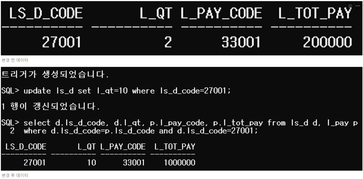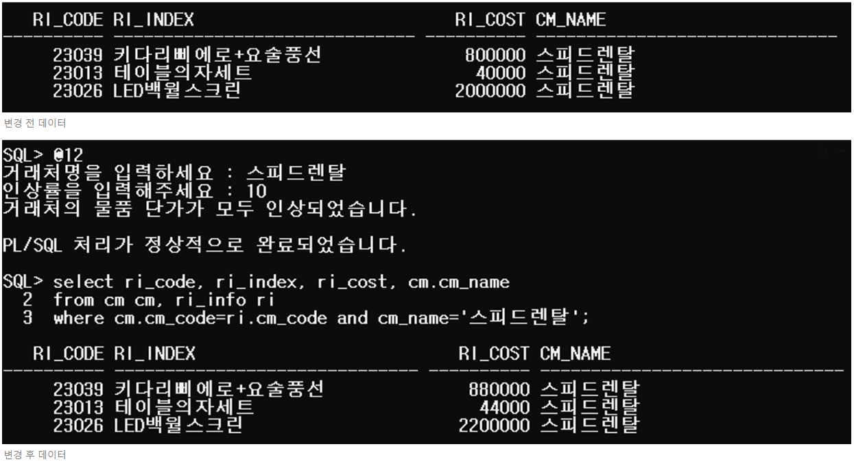 dbms_output.put_line('거래처의 물품 단가가 모두 인상되었습니다.');