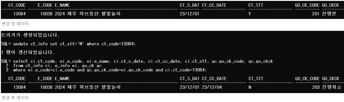 8. 계약 성사 여부가 N으로 변경 시 계약파기일을 오늘로 변경, 행사 진행상태는 '취소'로 변경하는 트리거