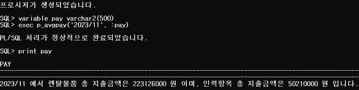 v_avgpay:=v_paydate||' 에서 렌탈물품 총 지출금액은 '||v_ri||' 원 이며, 인력항목 총 지출금액은 '||v_l||' 원 입니다.';