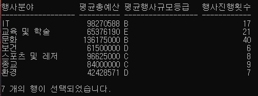 4. 행사 분야별 평균총예산, 평균 행사규모등급, 진행횟수를 조회하시오.